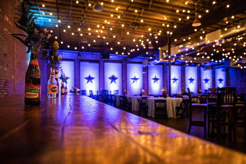 The first night’s Oktoberfest Y’all themed welcome event at Gilley’s Dallas was full of festive German-style décor. From blue and white pennant flags and string lights hanging from the ceiling to a custom German-themed menu, every aspect of the event highlighted this whimsical theme. Guests were greeted by a strolling accordionist in traditional lederhosen and custom arrow signage pointed them in the direction of all the possible activities. We used a combination of rounds and communal tables to replicate a traditional German beer hall. Each table had either beer growler or beer bottle centerpieces that contained Blue Cornflower, the national flower of Germany.
